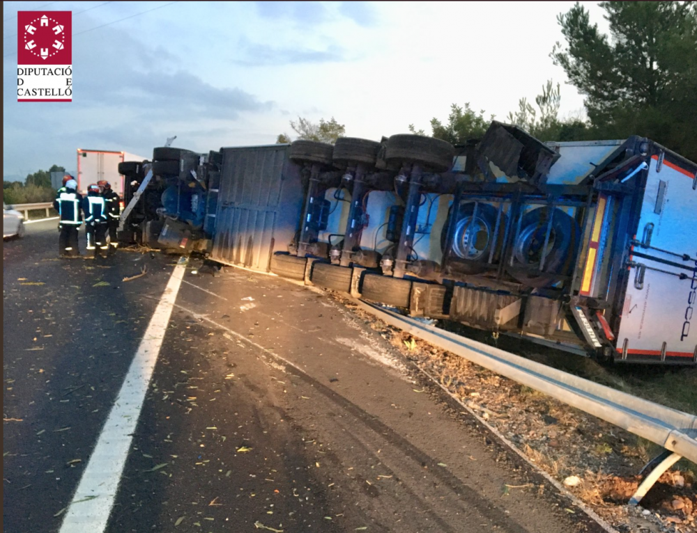 Vuelca un camión en la AP7 entre Vila-real y Almassora y se produce una fuga de gasoil del depósito