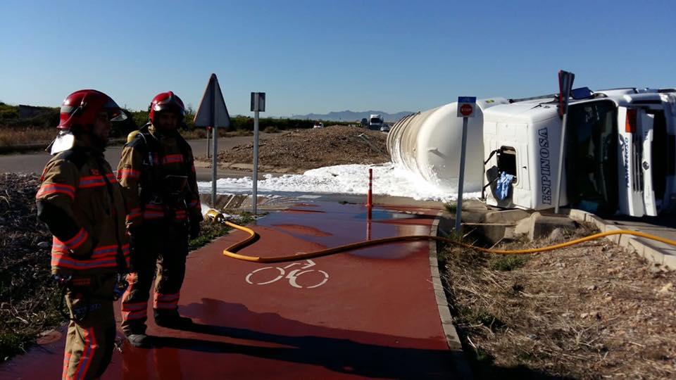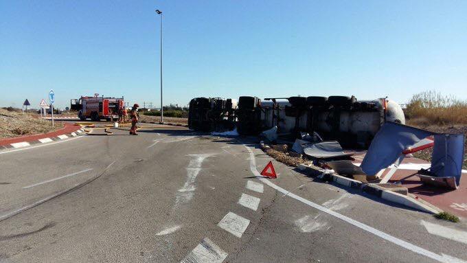 Un camión que transportaba mercancías peligrosas ha volcado esta mañana, sobre las 11:30 horas en la CV-183 a la altura de los accesos a la CS-22 de Castellón. La alerta se produjo enseguida, ya que por la carga del camión se podían producir otro tipo de daños mucho más peligrosos que lo que era solo el vuelco del vehículo.