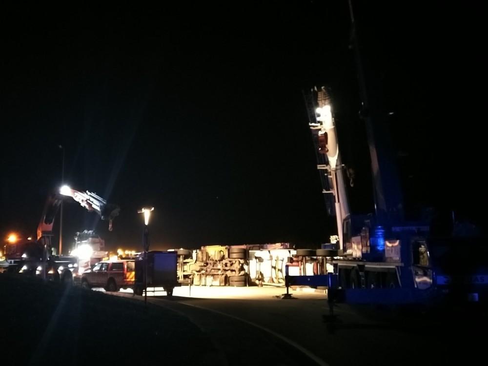 En estos momentos, continúan los trabajos de desvuelco y trasvase de la cisterna de transporte de propano accidentada y se mantienen cerradas la CS-22, CV-183 y la N-225.