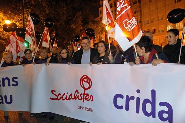 El secretario general del PSPV-PSOE, Ximo Puig, junto a la secretaria de Igualdad de la CEN, Rosa Peris, y otros representantes socialistas se han concentrado a las puertas de la sede, en la calle Blanquerías, desde donde han iniciado la marcha para participar en la manifestació.